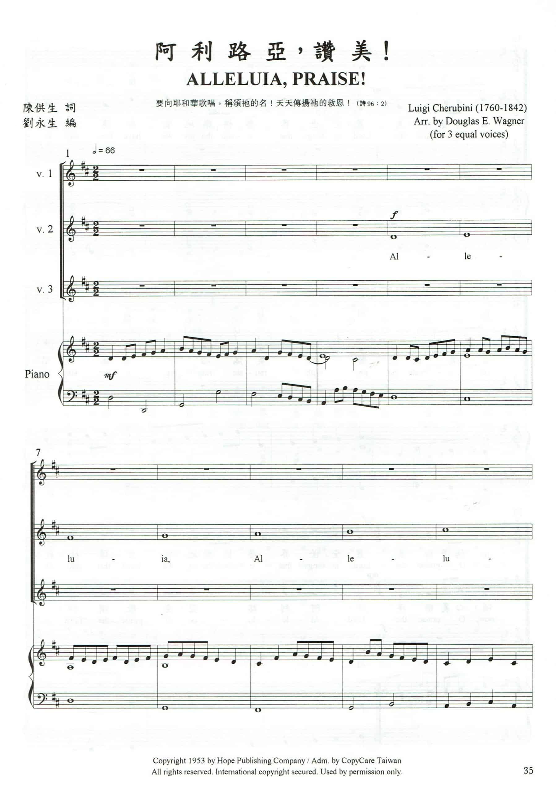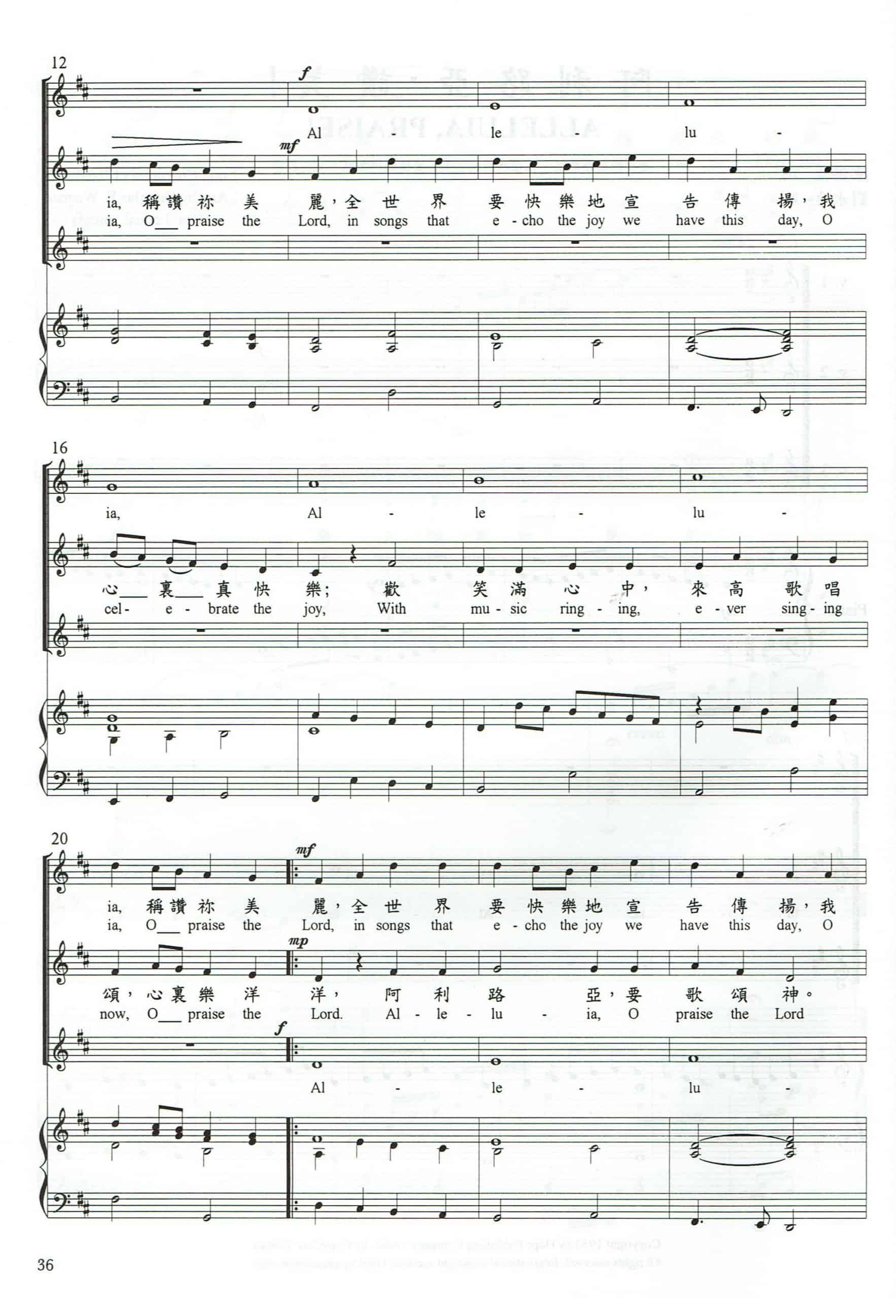 歡笑滿心中,來高歌唱頌,心裏樂洋洋,阿利路亞,要歌頌神。
