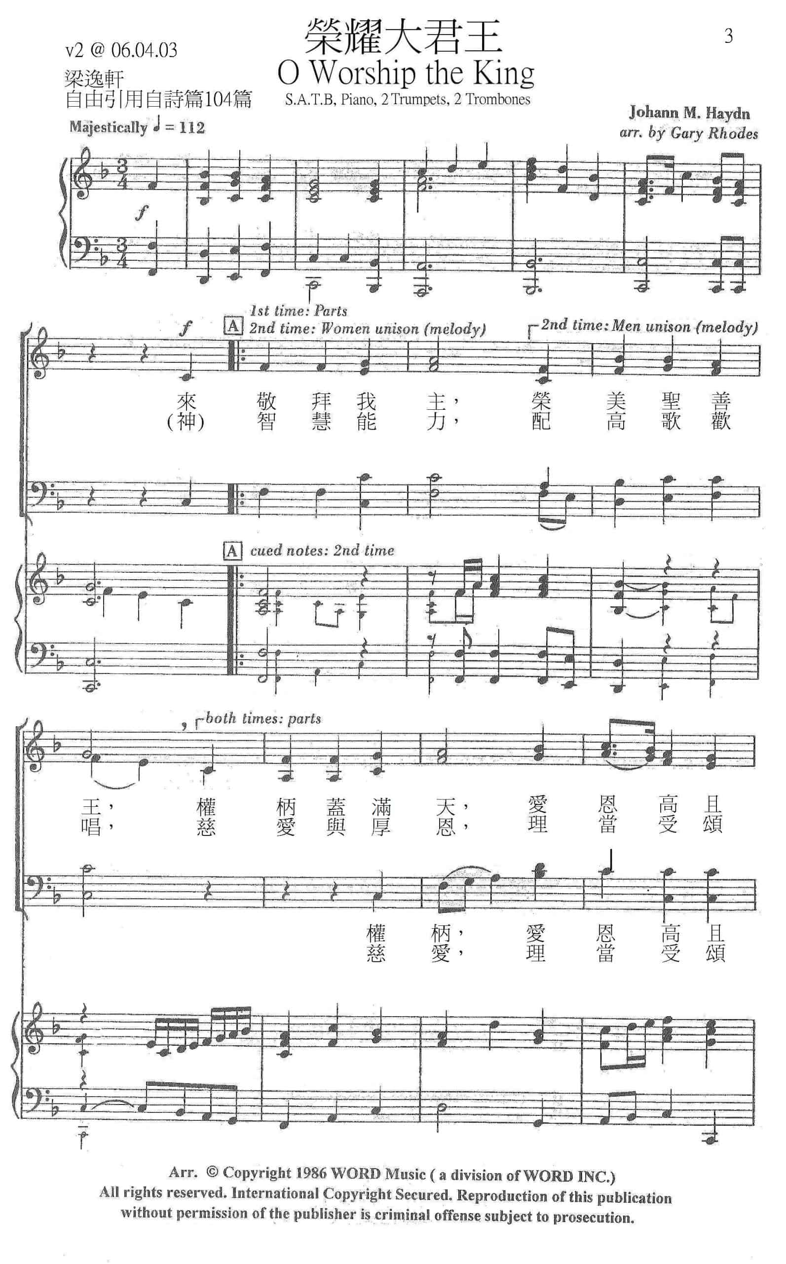 榮耀大君王的主線只有兩個:上帝的權能和慈愛。這首歌引用自詩篇104篇,整篇詩篇談及上帝的三種力量:創造、供應、管理。音樂採用了耳熟能詳的Lyons曲調,對會眾 亦無甚難度。