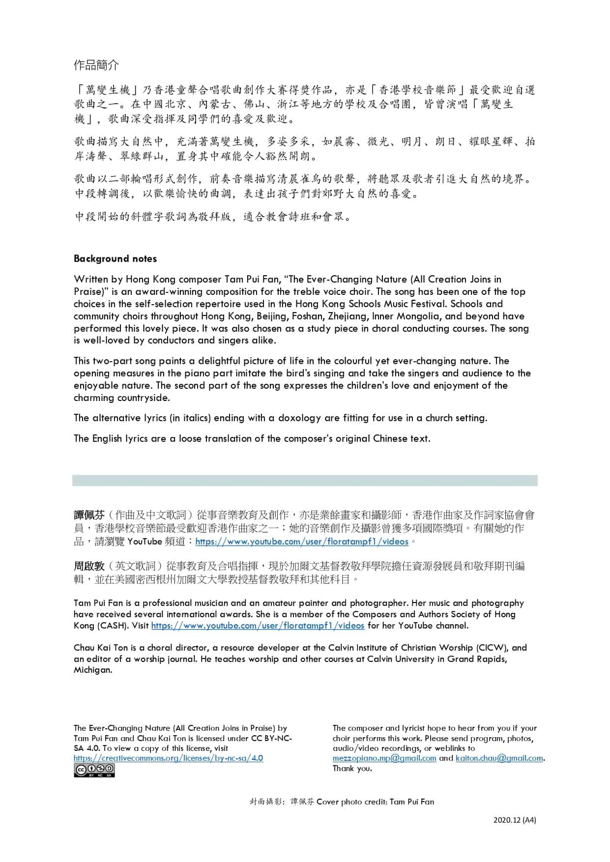 “萬變生機” 作品簡介 「萬變生機」乃香港童聲合唱歌曲創作大賽得獎作品,亦是「香港學校音樂節」第54屆指定參賽歌曲及 最受歡迎自選歌曲之一。在中國北京、內蒙古、佛山、浙江等地方的學校及合唱團,皆曾演唱「萬變生機」,歌曲深受指揮及同學們的喜愛及歡迎。 歌曲描寫大自然中,充滿著萬變生機,多姿多采,如晨霧、微光、明月、朗日、耀眼星輝、拍岸濤聲、翠綠群山,置身其中確能令人豁然開朗。 歌曲以二部輪唱形式創作,前奏音樂描寫清晨雀鳥的歌聲,將聽眾及歌者引進大自然的境界。 中段轉調後,以歡樂愉快的曲調,表達出孩子們對郊野大自然的喜愛。