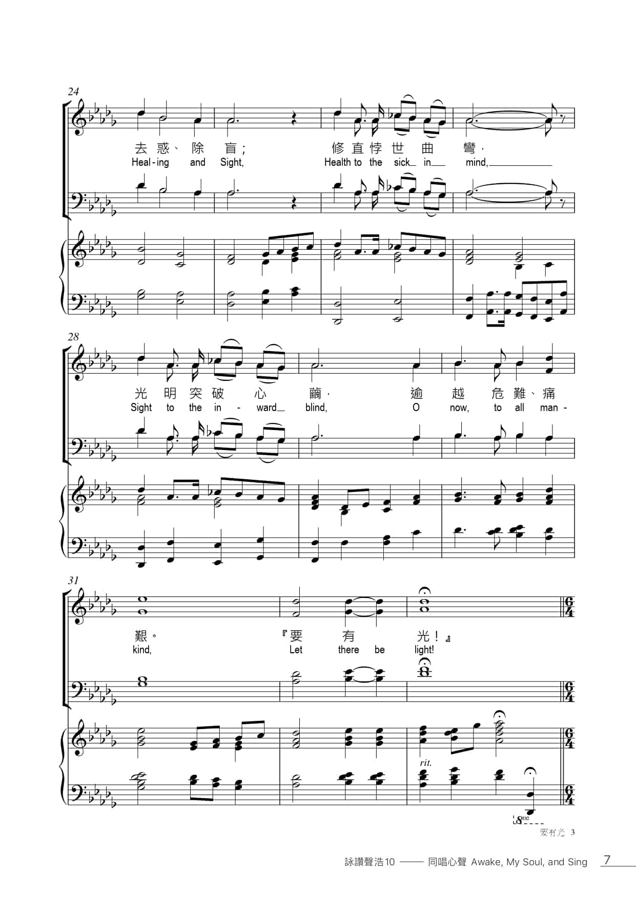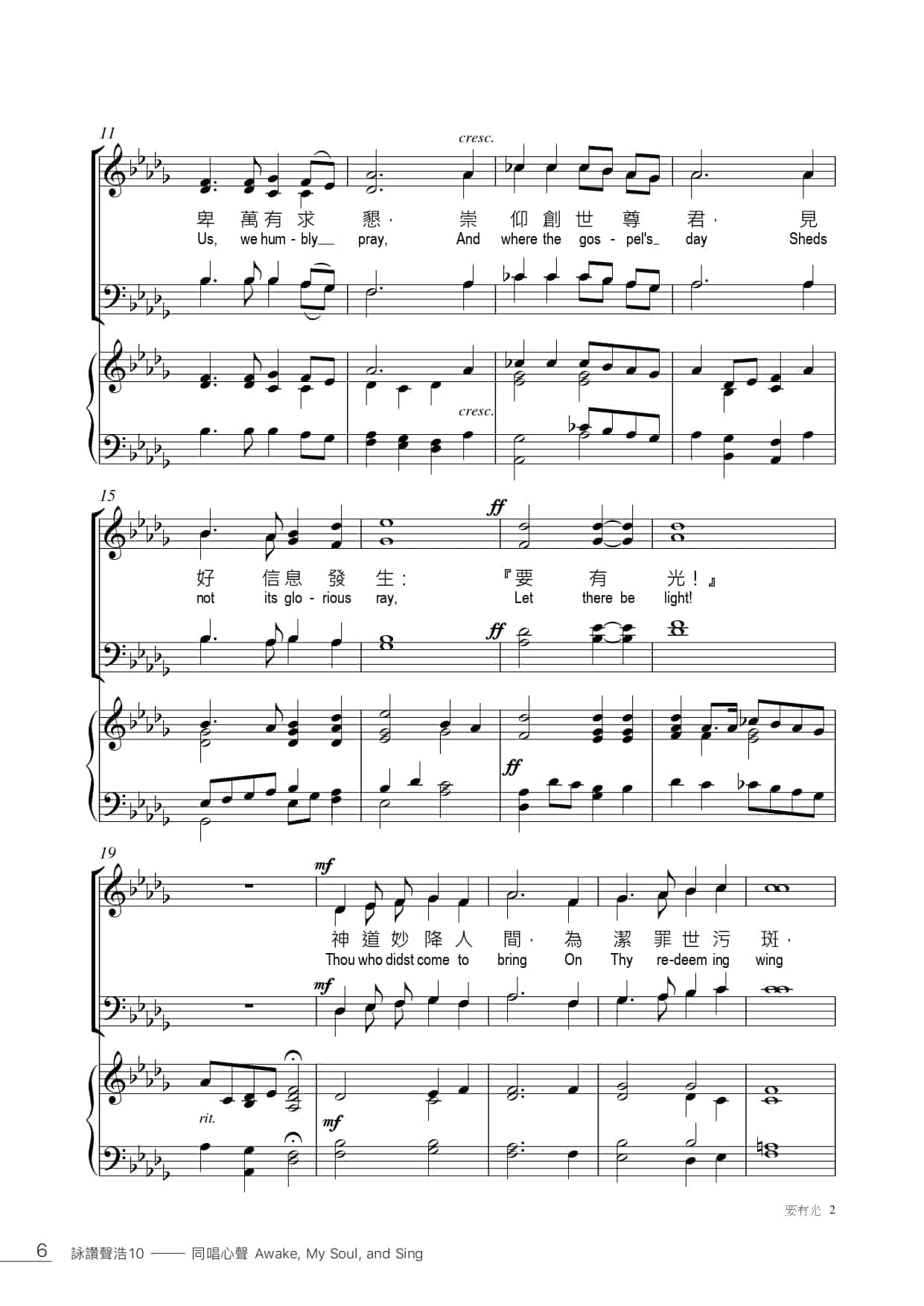 此曲可分為四段,首三段分別以聖父、聖子、聖靈各自位格之神聖動態為重點,末段則是三位一體的歸納描述。每一段都以「要有光」(最後一次為「要看見光」)作結尾。這四次「光」的出現都採用一樣的和聲。練習時可就力度,音色,吐字等給予四次「光」不同層次的變化。第三段轉到6/4拍子,傳達奧祕感,練習時可以柔和緊緻的音色帶出此段和聲色彩較豐富的特色,練習時要注意轆豐厚和聲的處理。最後一段為男女聲對唱,重現首段的旋律,要注意聲部間的平衡(特別是出現男女比例不平衡的情況時),造出呼應的效果。結尾的「要看見光」應該是四次中最強的一次,練習時要注意力量的鋪排,預留全曲高潮在最後。