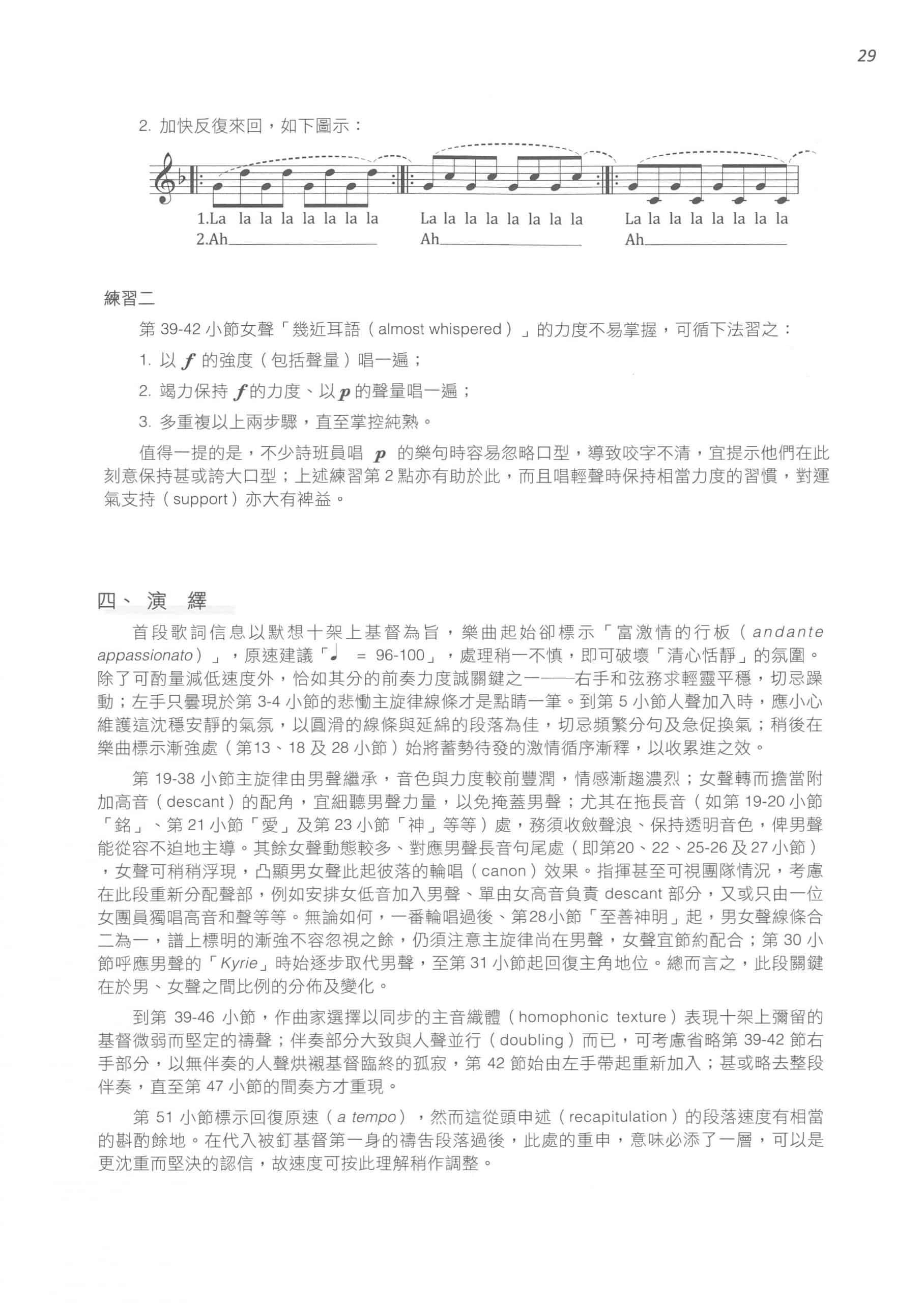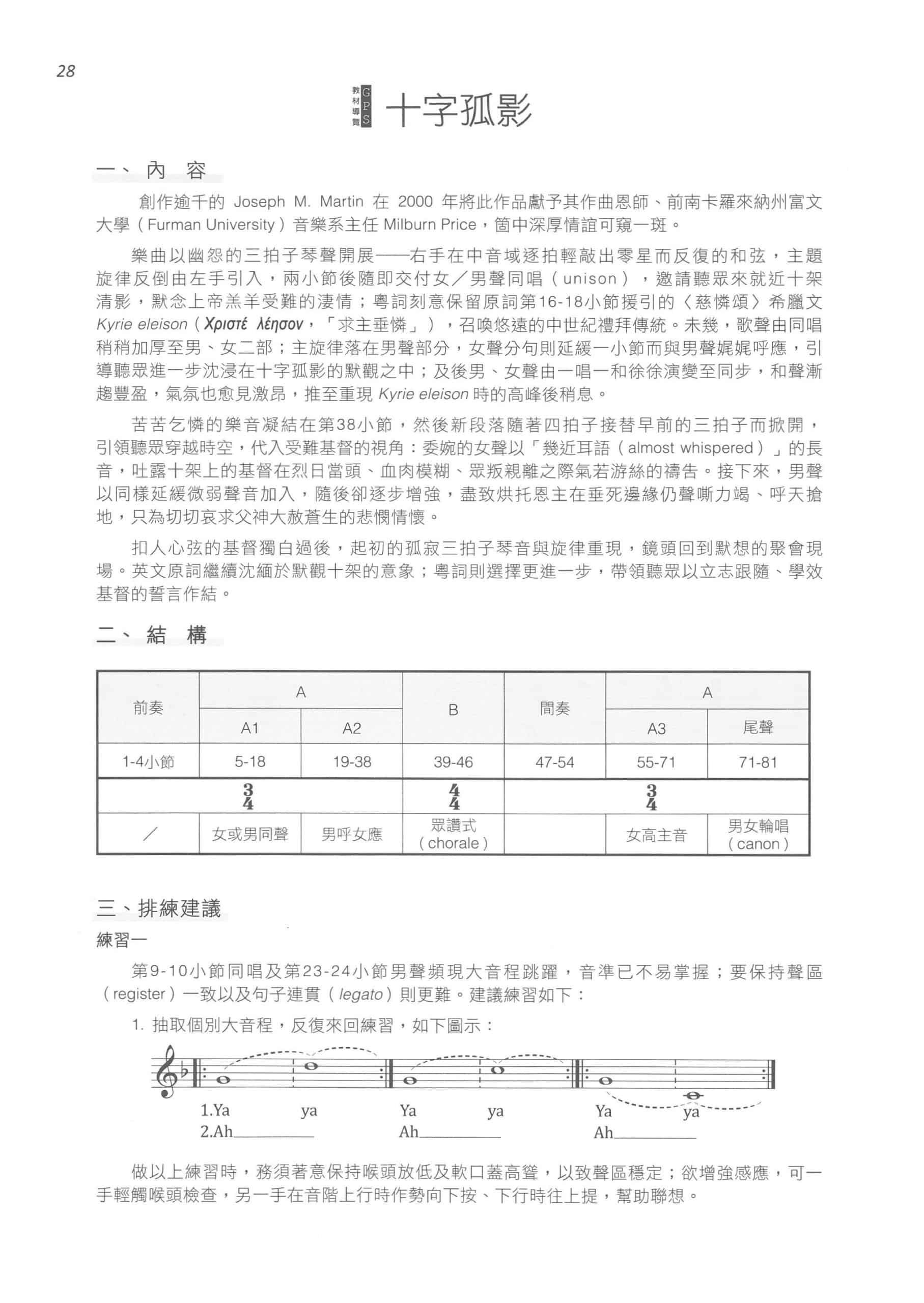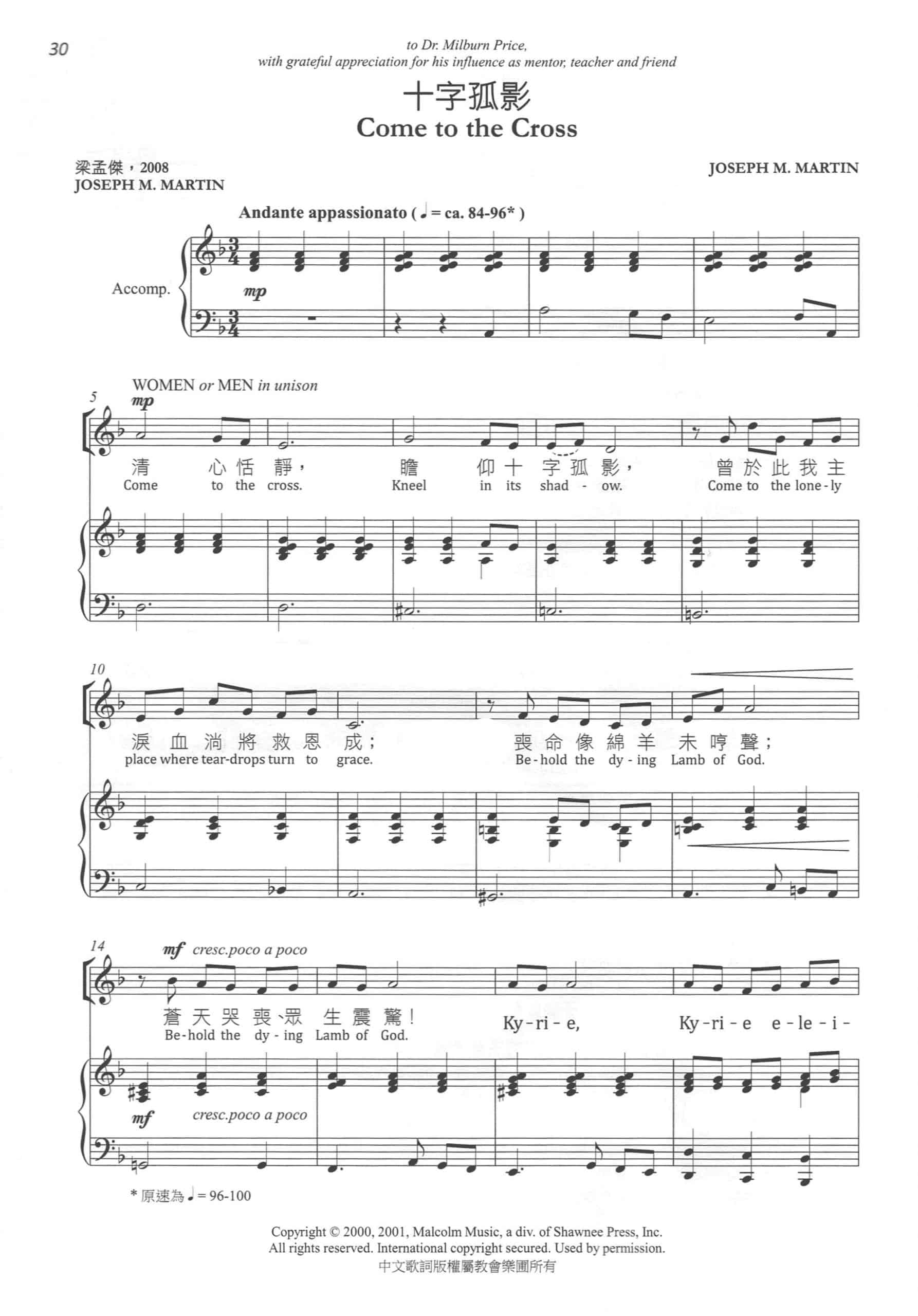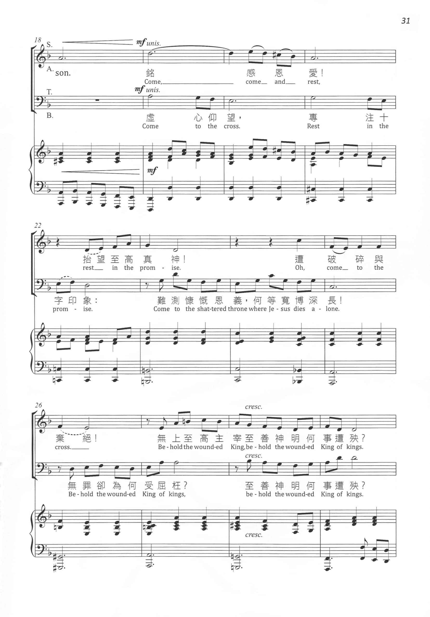 樂曲以幽怨的三拍子琴聲開展一右手在中音域逐拍輕敲出零星而反復的和弦,主題旋律反倒由左手引入,兩小節後隨即交付女/男聲同唱(unison),邀請聽眾來就近十架冫冃影,默念上帝羔羊受難的淒情;粵詞刻意保留原詞第16一18小節援引的<慈憐頌>希臘文Kyrie eleison(「求主垂憐」),召喚悠遠的中世紀禮拜傳統。未幾,歌聲由同唱稍稍加厚至力丶女二部;主旋律落在男聲部分,女聲分句則延緩一小節而與男聲娓娓呼應,引導聽眾進一步沈浸在十字孤影的默觀之中;及後男丶女聲由一唱一和徐徐演變至同步,和聲漸趨豐盈,氣氛也愈見激昂,推至重現Kyrie eleison時的高峰後稍息。