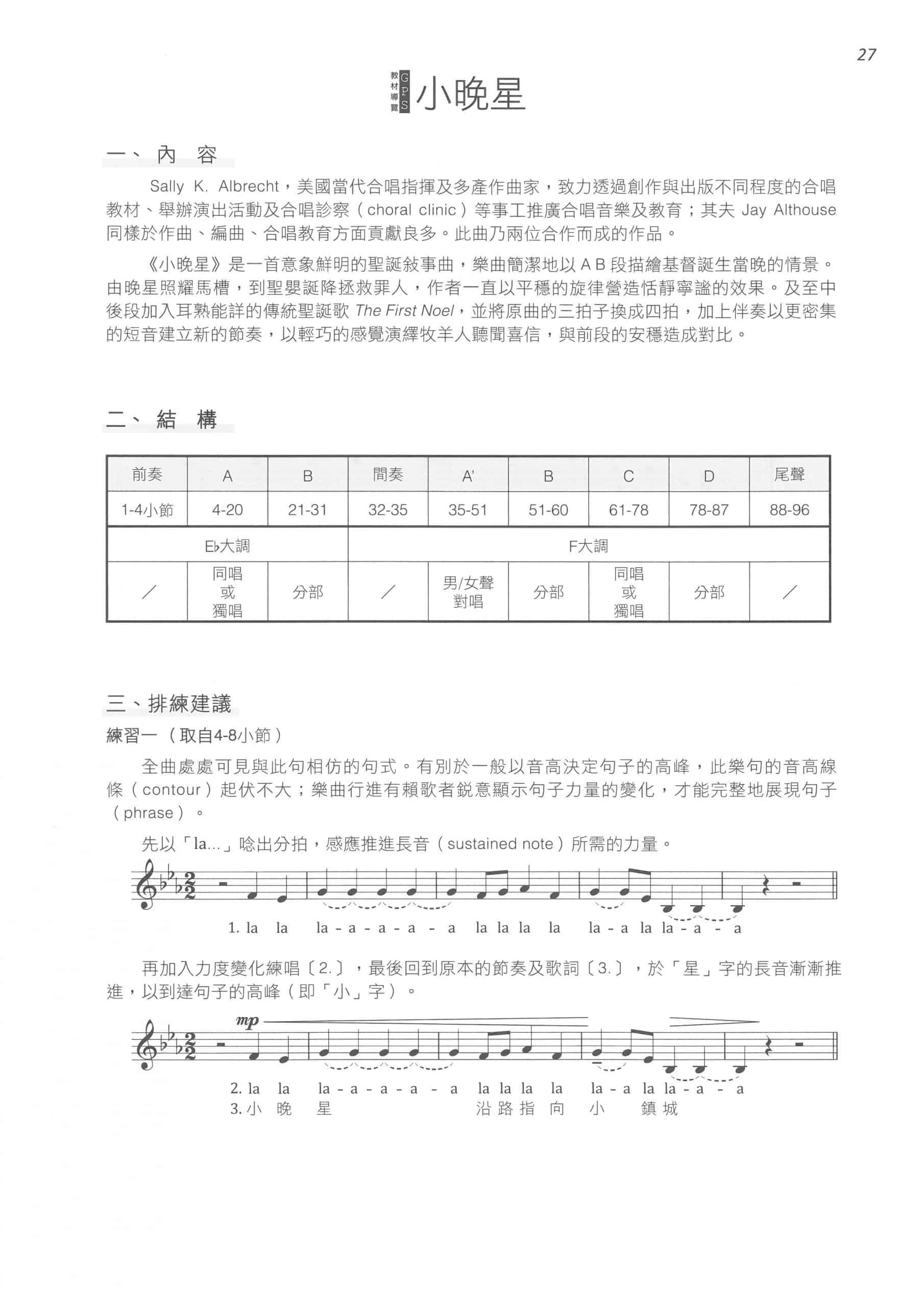 《小晚星》是一首意象鮮明的聖誕和敘事曲,樂曲簡潔地以AB 段描繪基督誕生當晚的情景。由晚星照耀馬槽,到聖嬰誕降拯救罪人,作者一直以平穩的旋律營造恬靜寧謐的效果。及至中後段加入耳熟能詳的傳統聖誕歌The First Noel,並將原曲的三拍子換成四拍,加上伴奏以更密集的短音建立新的節奏,以輕巧的感覺演繹牧羊人聽聞喜信,與前段的安穩造成對比。