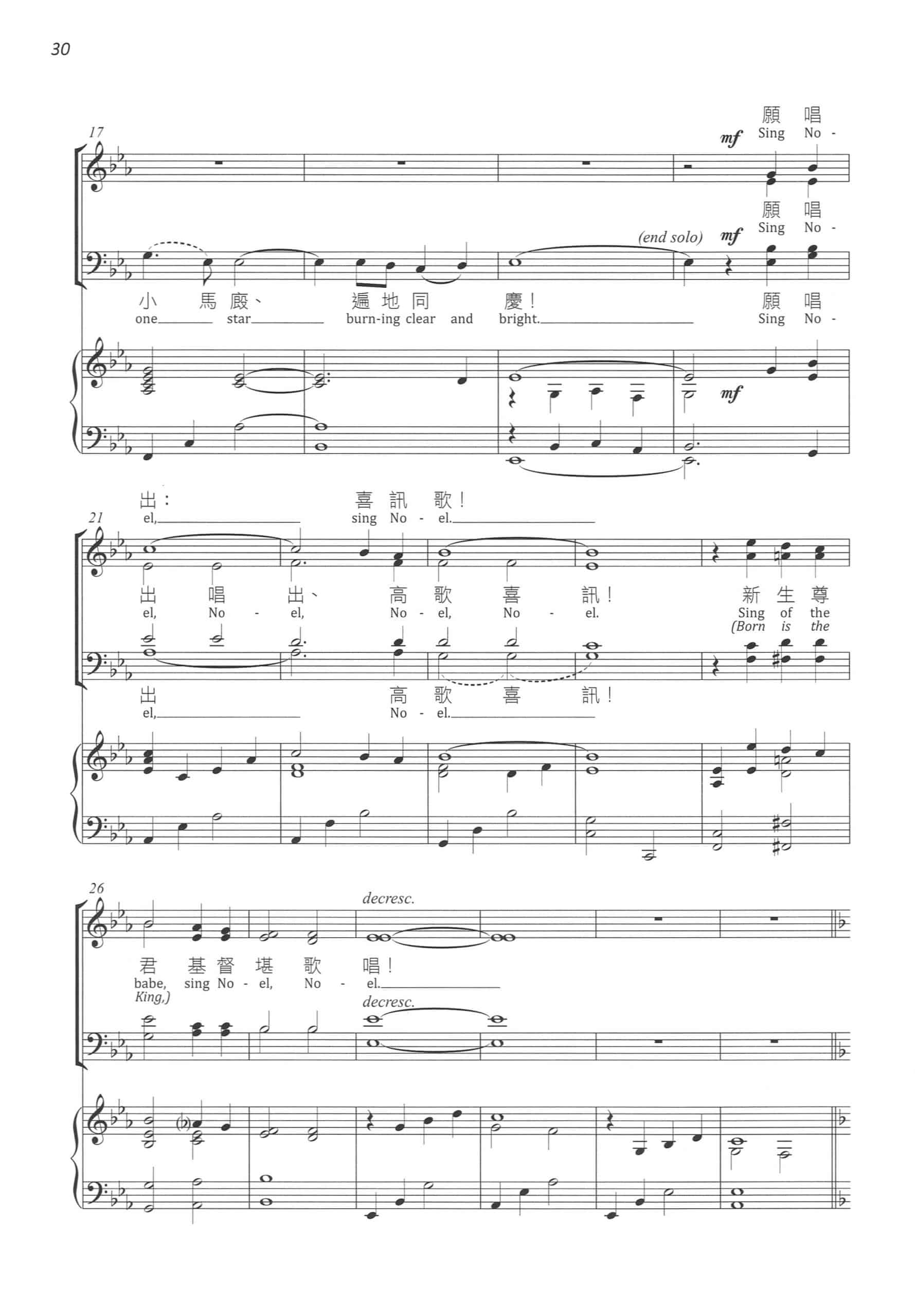 小聖嬰,(來凡塵;)降生於這小馬棚。(何恬靜;)