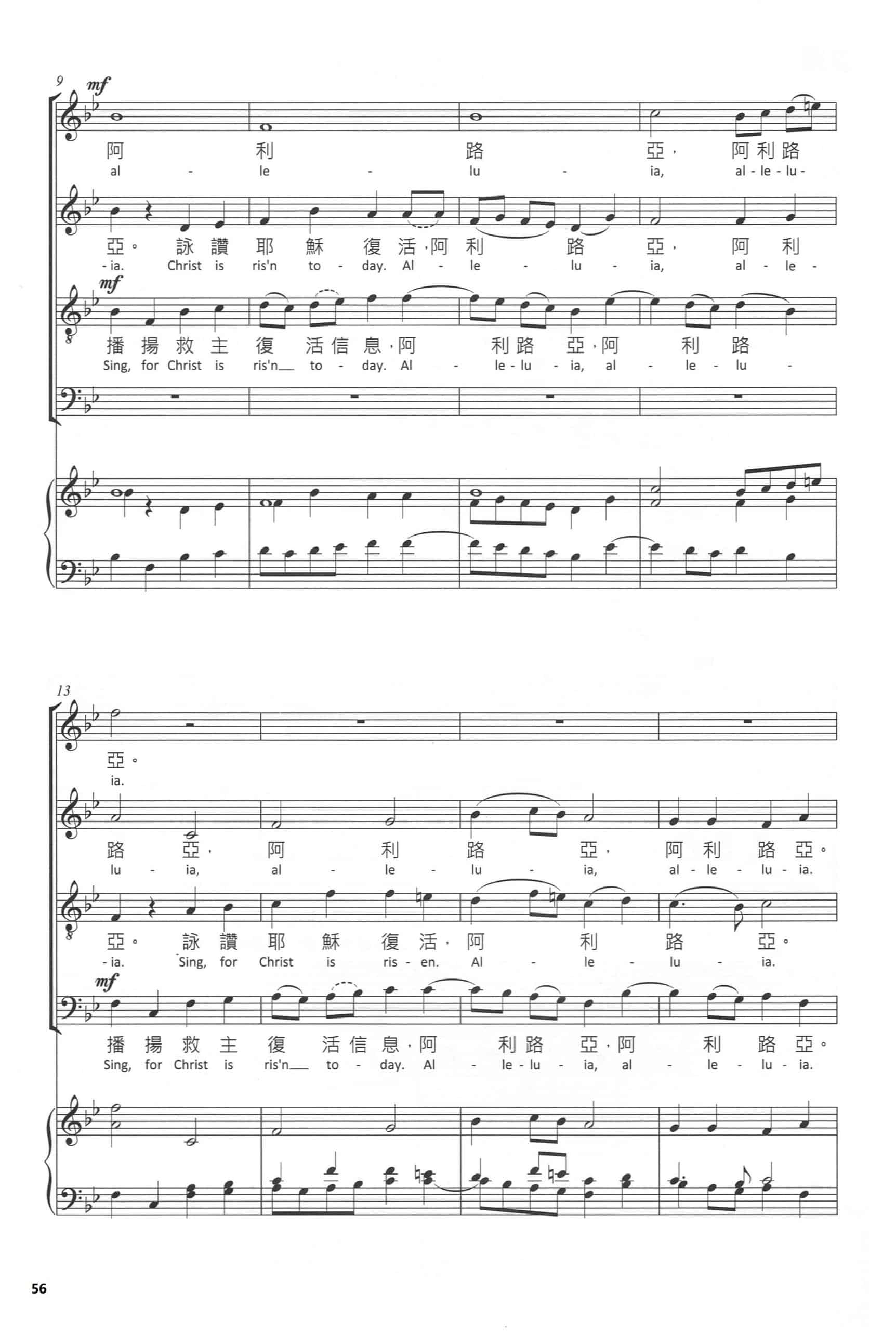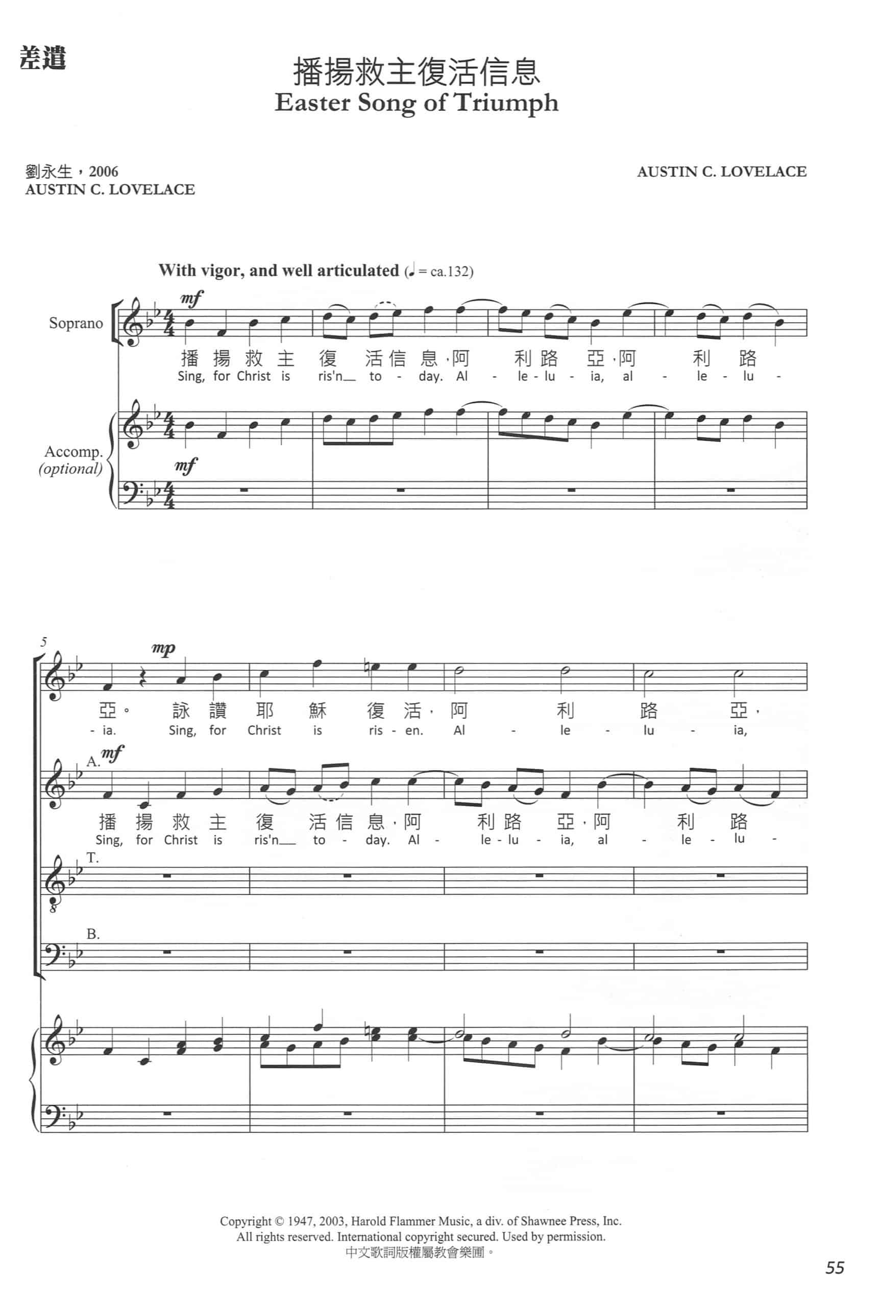 Austin C. Lovelace 是美國出色的作曲家、風琴師及合唱指揮,於協和神學院(Union Theological Seminary)獲得聖樂碩士及博士學位。此曲勸勵信徒歡樂高歌,向外播揚救主復活訊息,以仿賦格(Quasi-Fugal)或對位(Contrapuntal)的手法突顯訊息多方多次被傳揚之感。此曲兩句主題要特意清晰:一、「播揚救主復活訊息」及二、「阿利路亞」;不同聲部詠唱時應強調吐字。此曲多聲道進行,指揮應考慮不同聲部的位置(Formation)及會場之聲響效果(Acoustics)與空間(Spatial elements)及歌曲速度(Tempo)之配合。