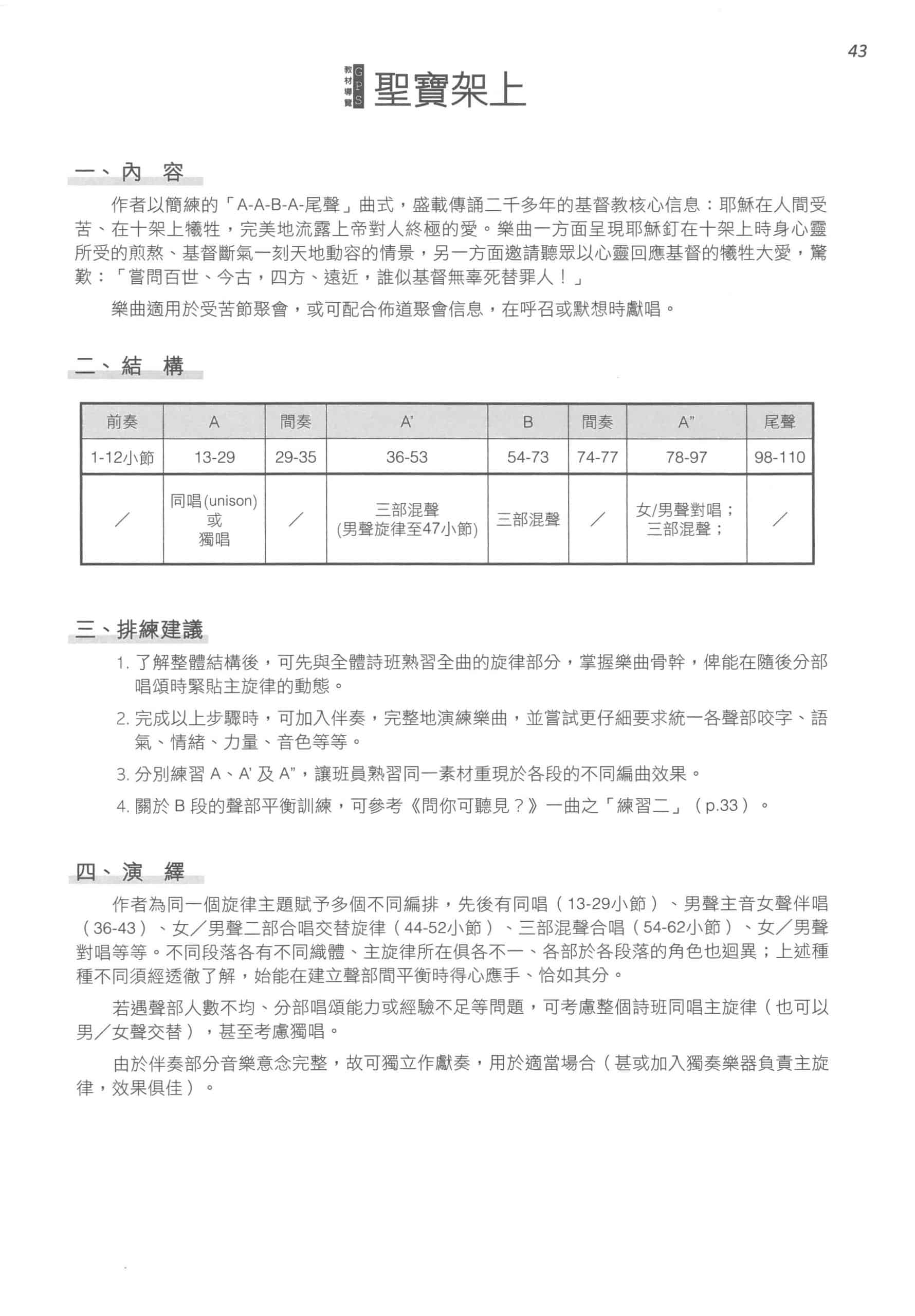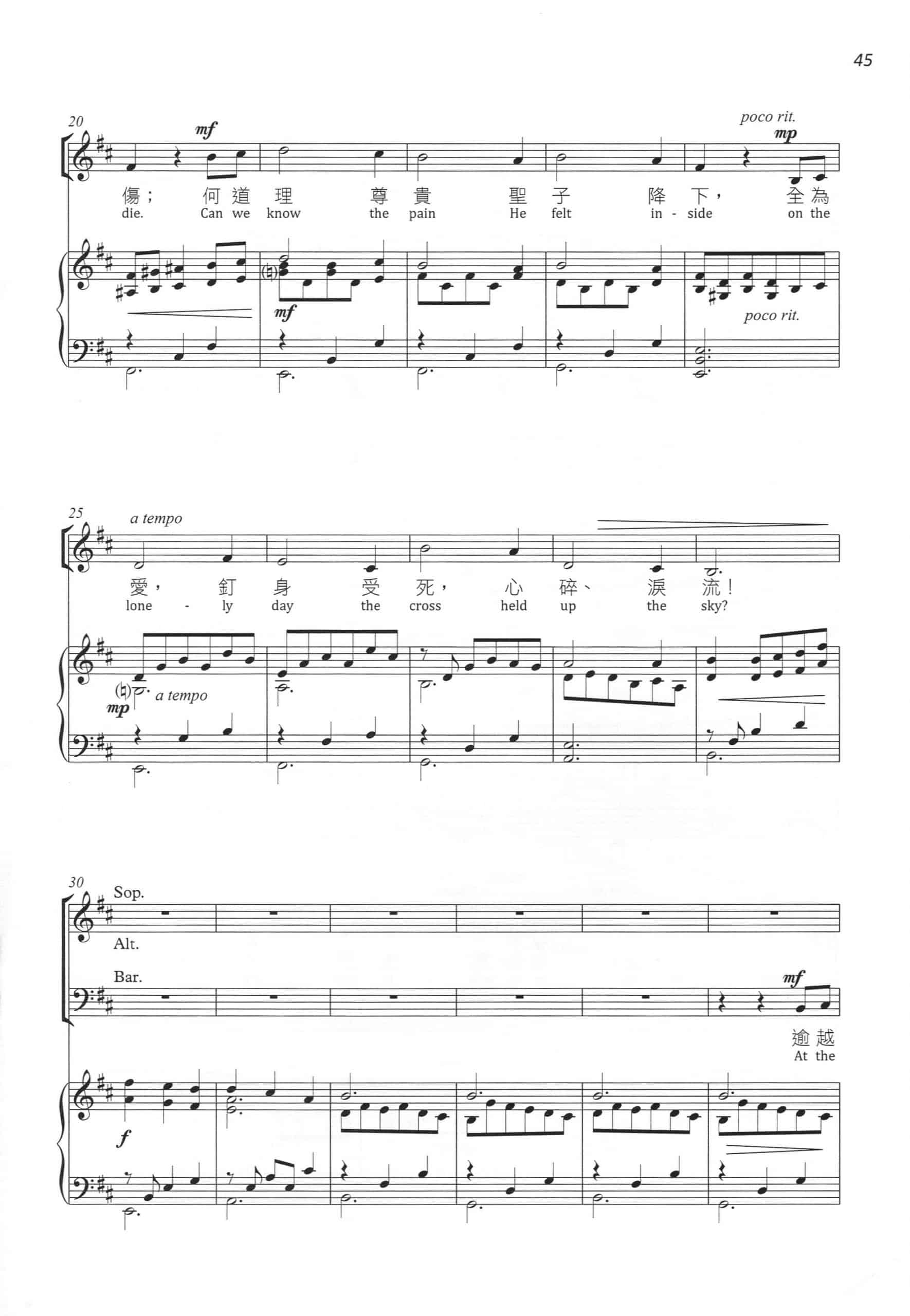 作者以簡練的「A-A-B-A-尾聲」曲式,盛載傳誦二千多年的基督教核心信息:耶穌在人間受苦、在十架上犧牲,完美地流露上帝對人終極的愛。樂曲一方面呈現耶穌釘在十架上時身心靈所受的煎熬丶基督斷氣一刻天地動容的情景,另一方面邀請聽眾以心靈回應基督的犧牲大愛,驚歎:「嘗問百世丶今古,四方丶遠近,誰似基督無辜死替罪人!」