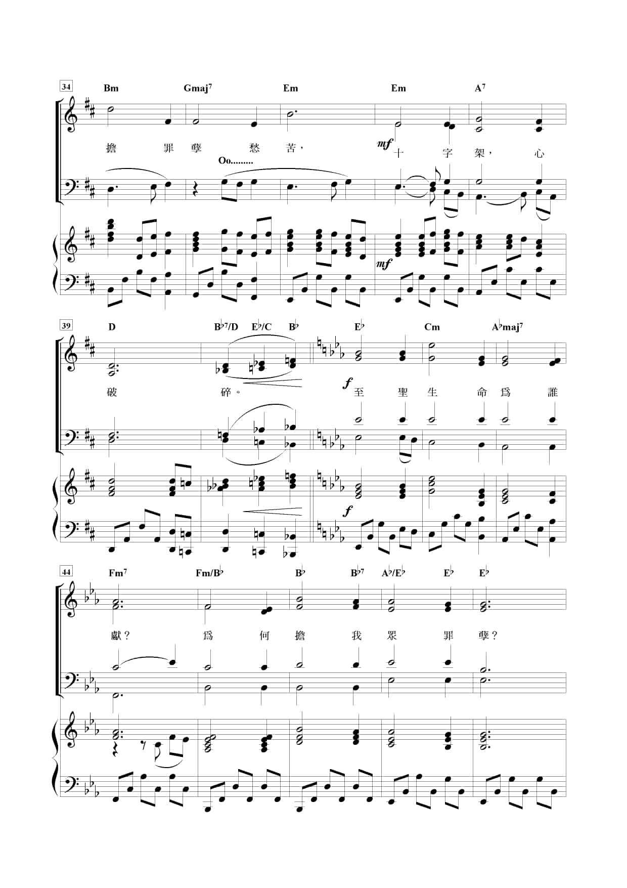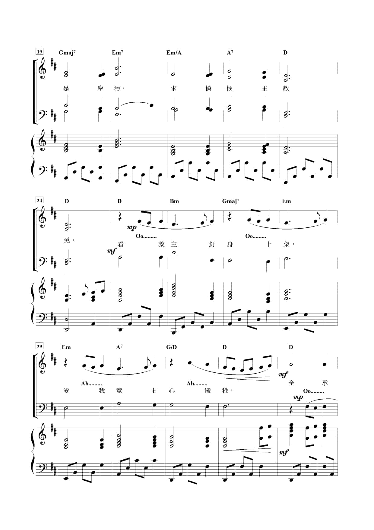 看救主釘身十架,愛我竟甘身犧牲, 全承擔罪孽愁苦,十字架,心破碎。