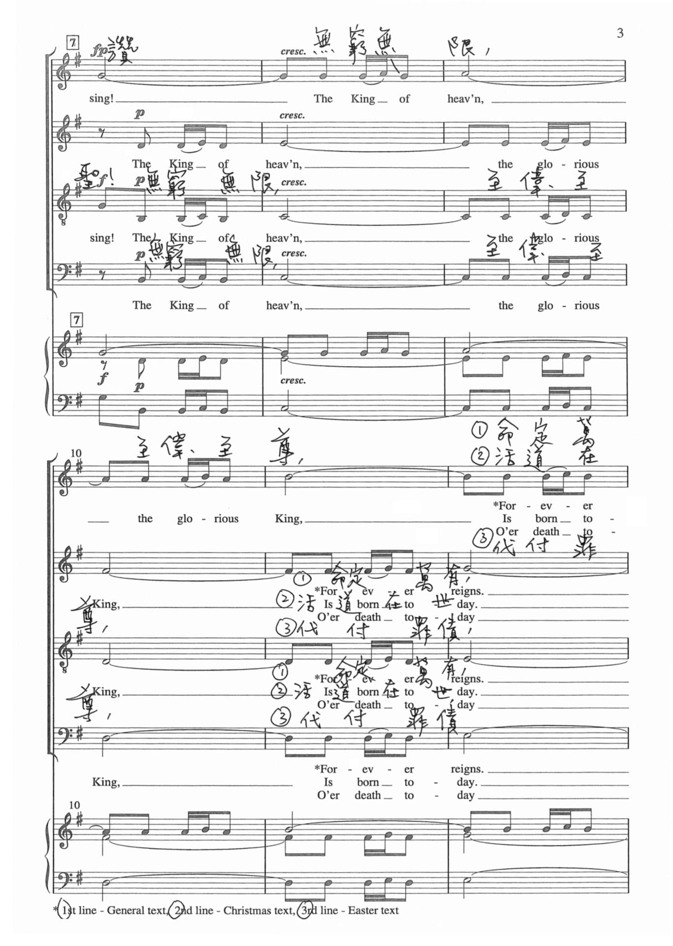 本曲共分為三個版本,分別適切常規使用(版本一),聖誕期(版本二)及復活期(版本三),敬請留意。