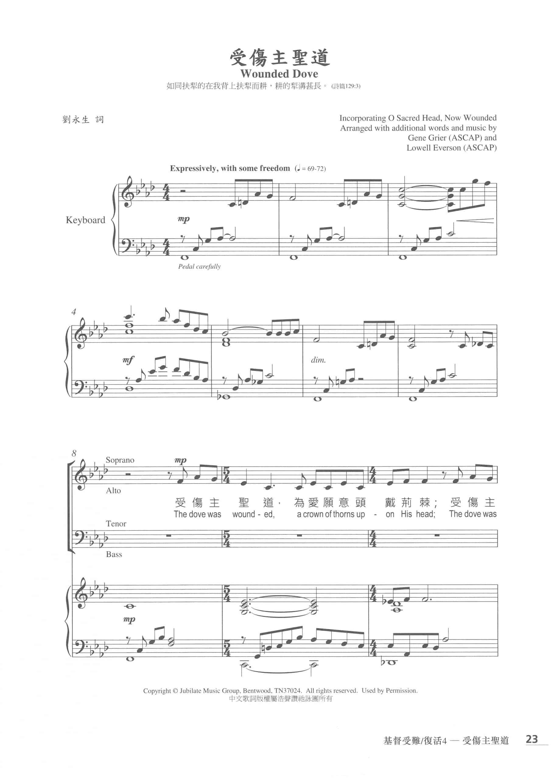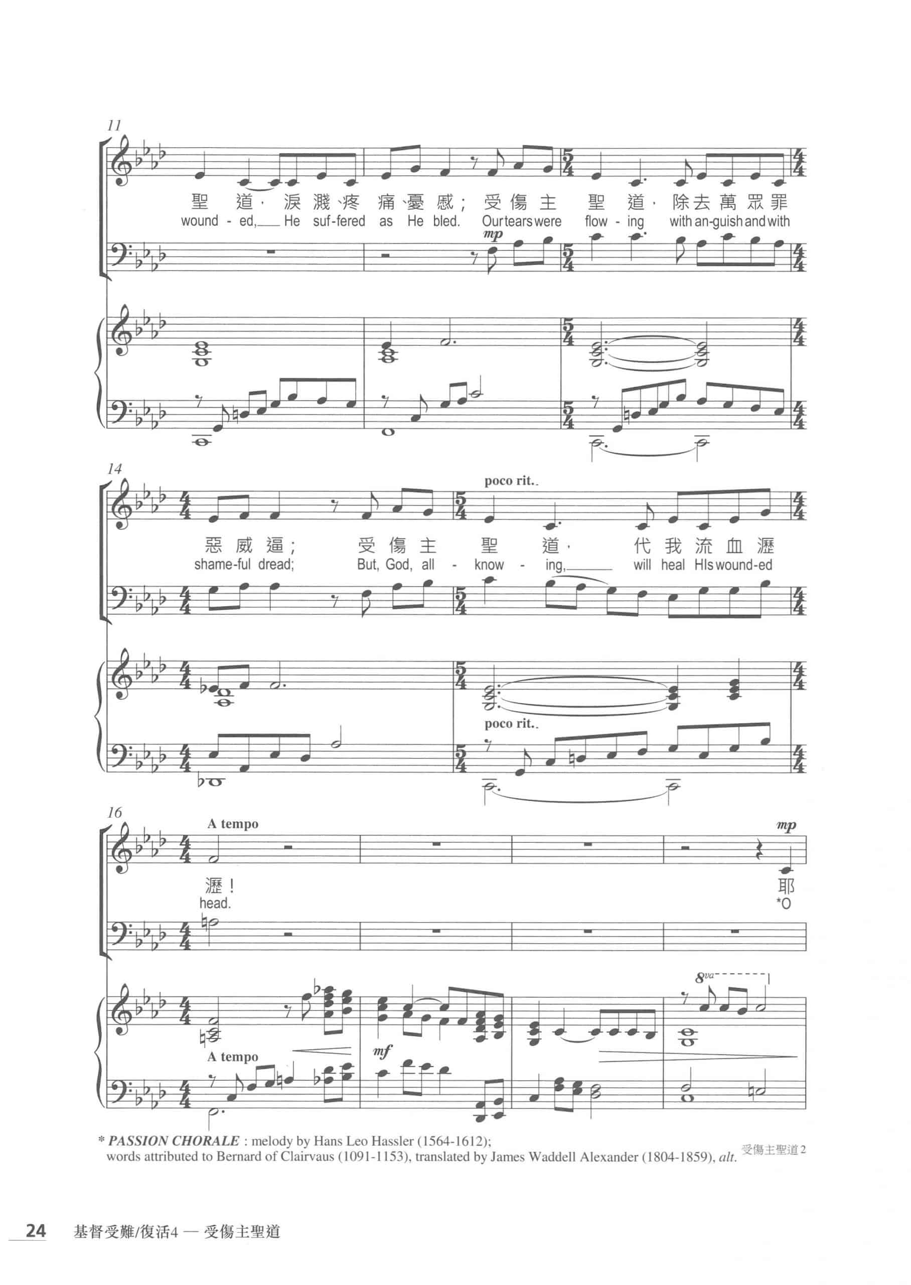 聖首受創從20小節進入,與首段的旋律互相配合,形成一副完美的圖畫。兩個旋律沒有主次,可帶出兩首詩歌本身獨有的氣氛。30小節是聖首受創的部分,和聲豐富,要帶出下三聲部的線條及特別的和聲。52小節詩歌轉調到C小調,是全曲高潮所在。此段兩首詩歌各佔一半,首半是原創部分,下半是聖首受創,詩歌的力量及情緒漸漸加強,練習時可注意音色的處理,及力量的持續。詩歌最尾以C大調和弦完結,猶如在黑暗中的一線曙光。女中音的E natural最為重要,在各聲部及鋼琴皆沒有 E natural, 唯獨靠女中音能決定這個和弦的屬性。